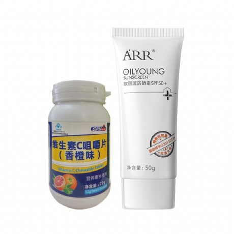 商品功效:ARR(ARR)欧丽源防晒霜SPF50+ 50g:清爽透薄质地,涂抹后在肌肤表面形成一层保护膜,保护肌肤免受阳光直射,缓解日晒引起的水分流失、晒伤等问题,改善晒后晒斑与肌糙状况,舒缓修护肌肤;防晒同时兼具隔离作用,质地轻盈不黏腻,帮助隔离彩妆与肌肤直接接触,水润隔离,温和呵护,令肌肤细腻光滑,盈润透亮。 健牌(KENSDA)益普利生牌维生素C咀嚼片【香橙味】1.2g*60片:抗氧化,清除自由基,美白;增强免疫力;促进胶原蛋白合成,有助伤口愈合;促进铁的吸收;