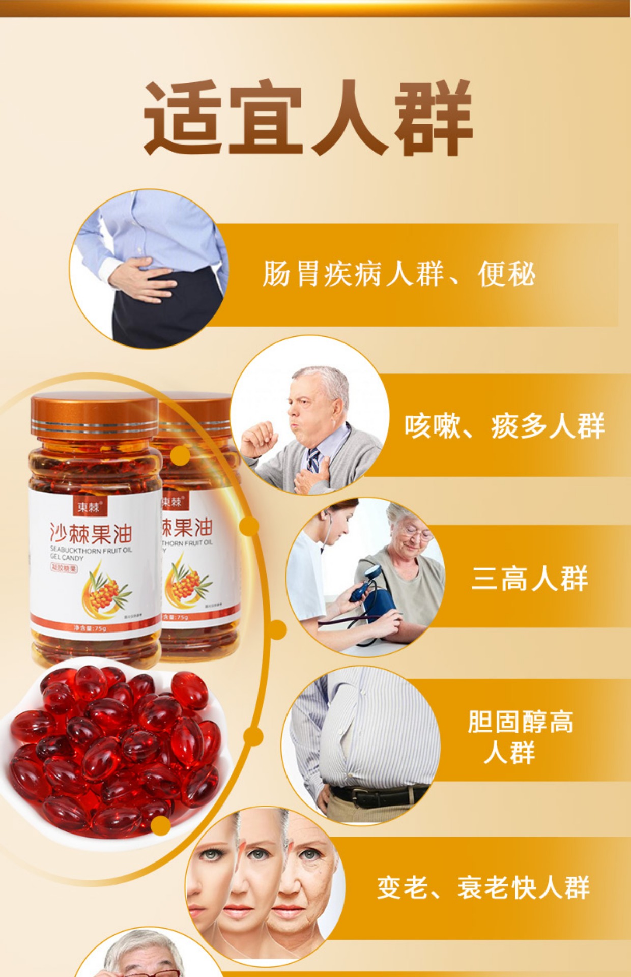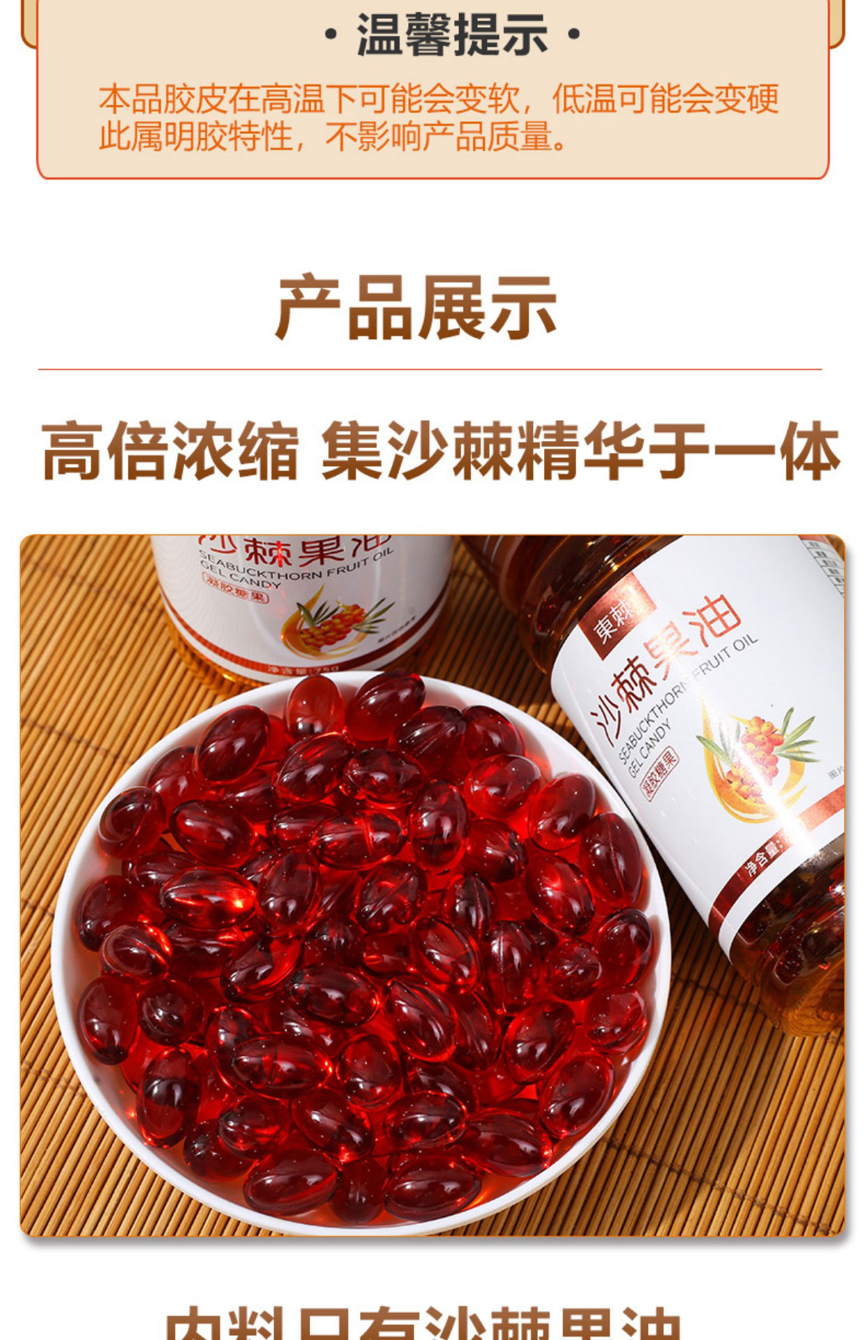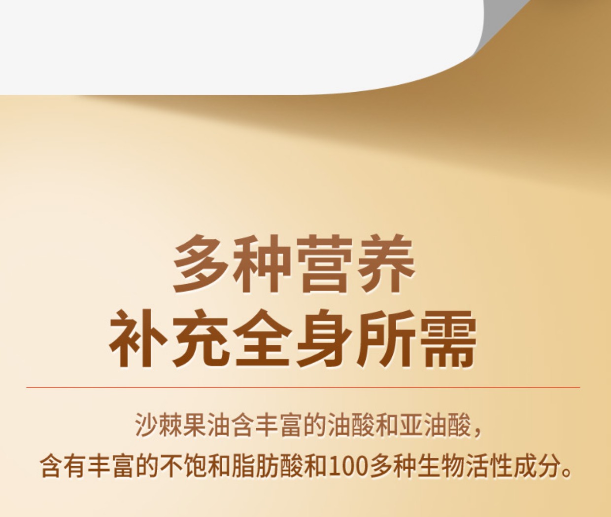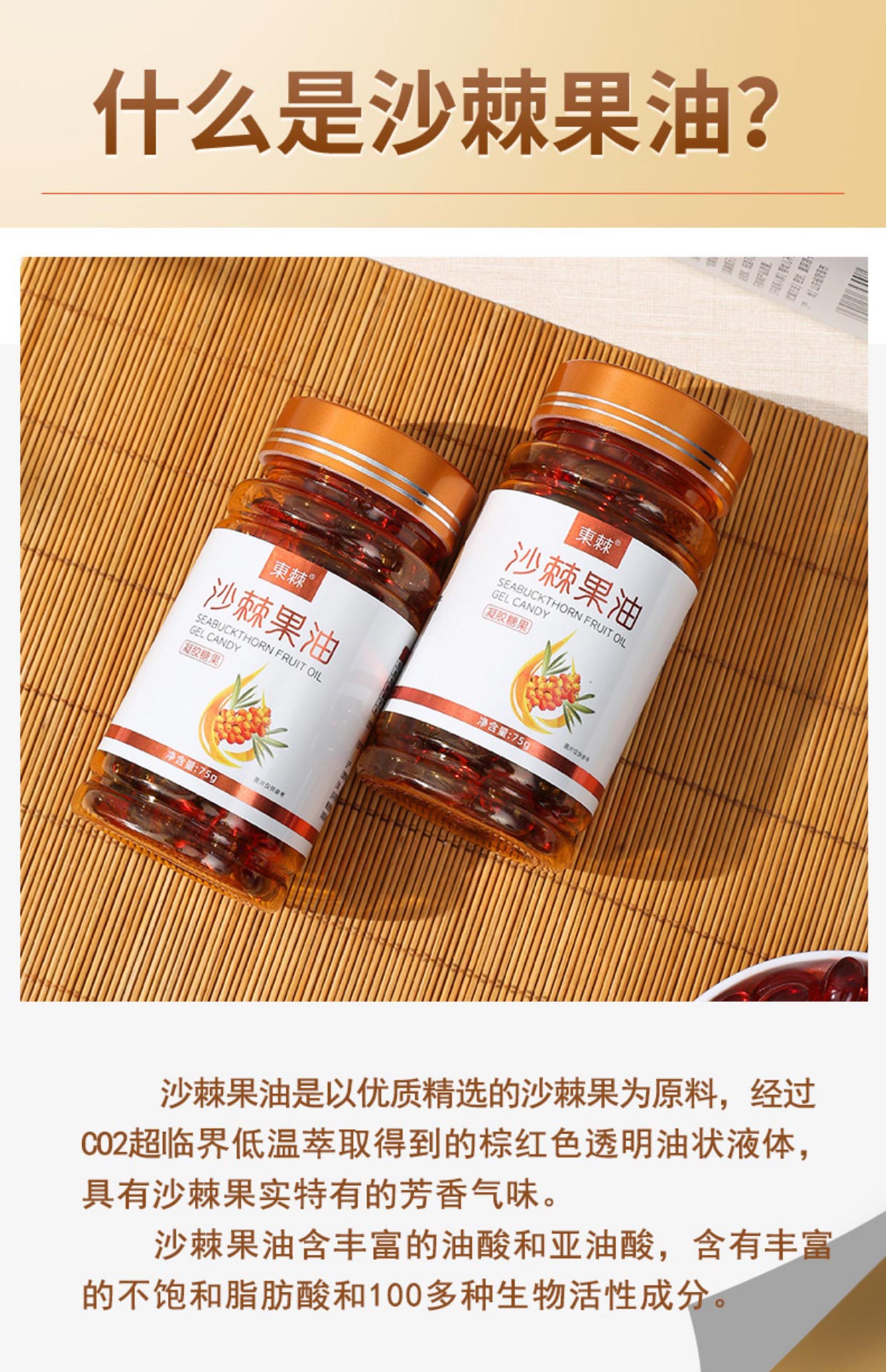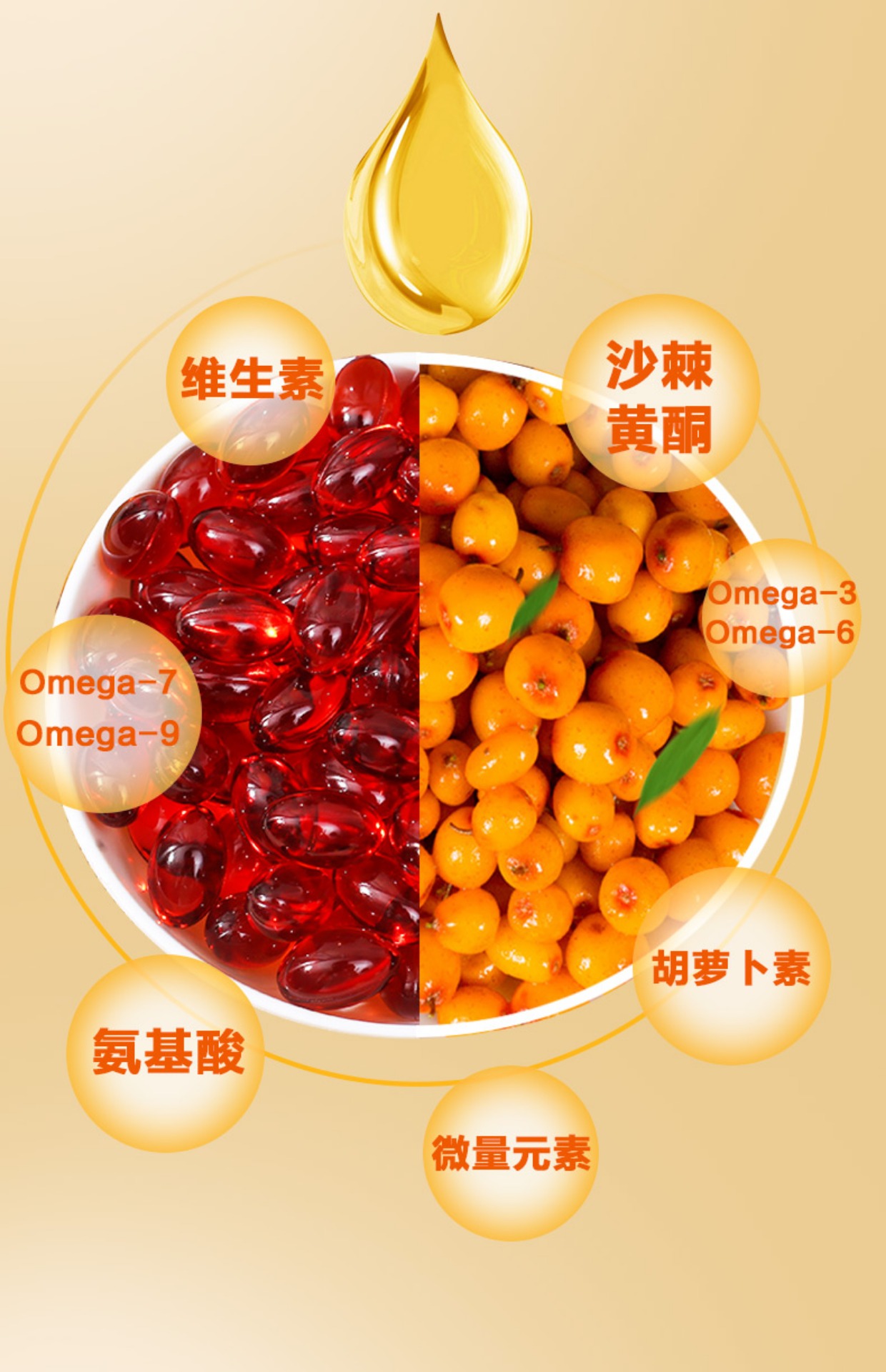 • 商品成分:维生素,Omega- 7,Omega-9,氨基酸,微量元素,胡萝卜素,Omega- 3,Omega-6,沙棘黄酮