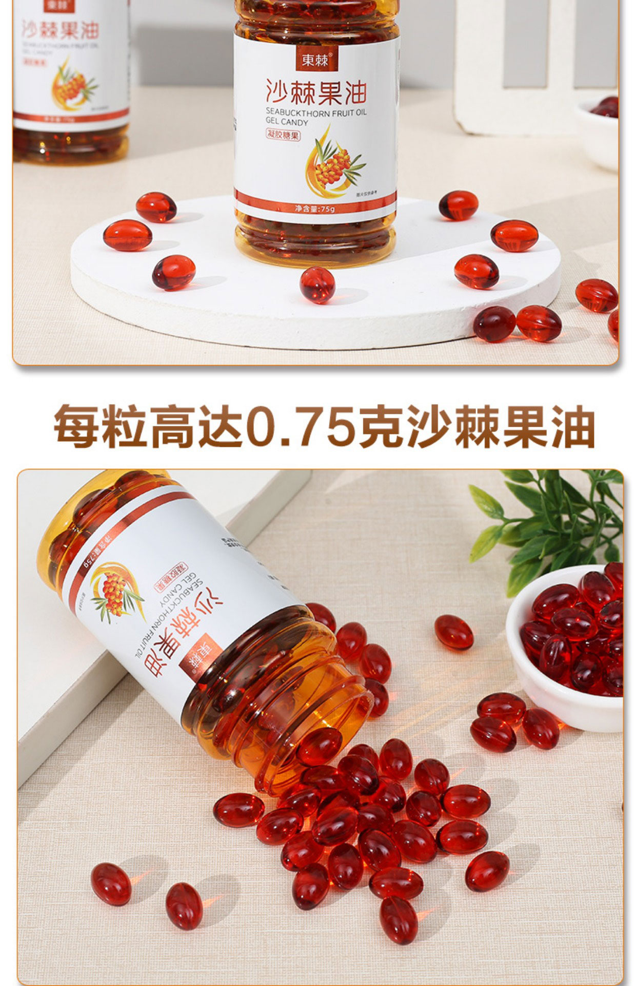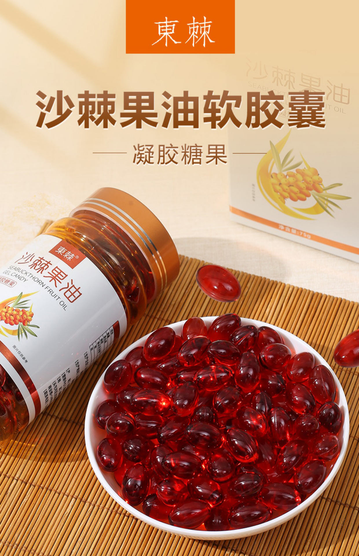 東棘(DONGJI)沙棘籽油凝胶糖果75g/瓶(0.75g/粒*100粒/盒)【一瓶装】